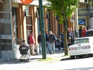 The Downtown Eastside has historically been populated by older, low-income people. Many are unwell; many do not have much to look forward to. The behaviour of low-income residents can appear to be disorganized. Other than the regular monthly distribution of welfare cheques, schedules do not seem to have much weight. But there are daily rhythms. Drug users are driven by the need to get a steady supply of drugs; their days are goal-oriented and busy. People who rely on social agencies for food have a regular routine; e.g., First United Church for breakfast, the Sally Ann for lunch, and the Union Gospel Mission for dinner. This routine involves a lot of time standing and waiting in line, often in the cold and rain. Many people are committed to volunteer work, artistic endeavours, or activist projects and focus their days on these interests. But others who do not have volunteer or paid jobs or do not have family commitments can drift through the day if they want to.